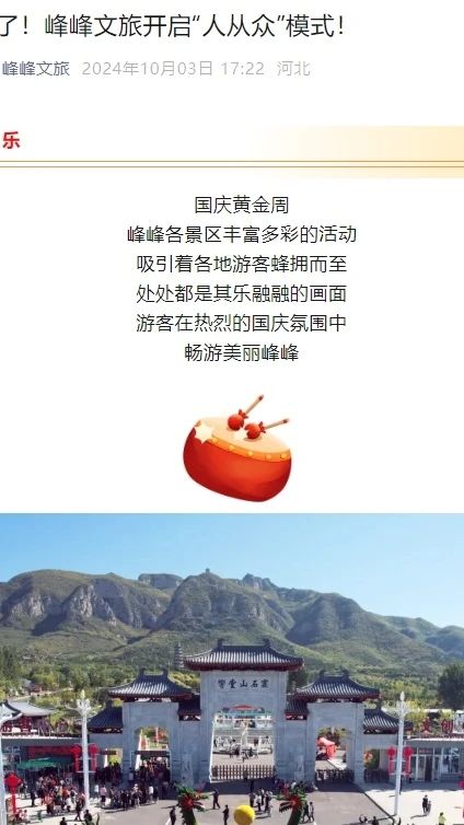 这个“十一”假期,响堂山石窟游客如潮,大量游客通过“央视”“小红书”“抖音”“视频号”等媒体平台知晓了在河北邯郸峰峰境内竟隐藏着一座绝不逊色于“龙门”“云冈”“敦煌”的宝藏石窟—响堂山石窟。于是,早已做足了攻略的游客们趁着“十一”假期从祖国的大江南北、长城内外一起奔赴而来,汇聚于此。一时间响堂山秋日胜春朝,好评涌如潮!