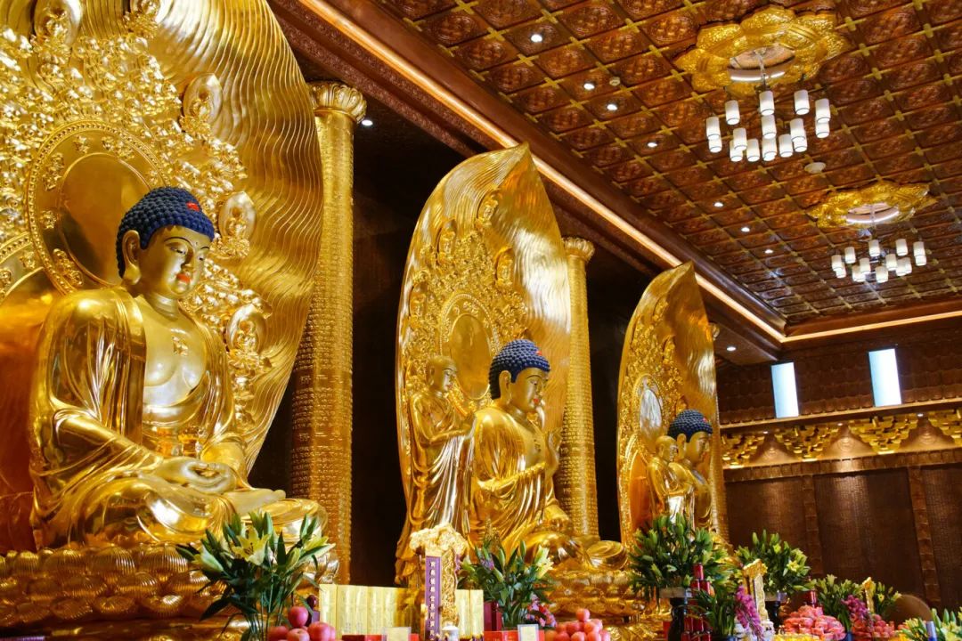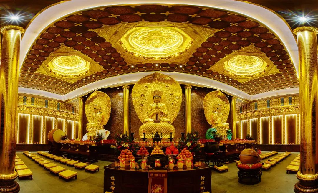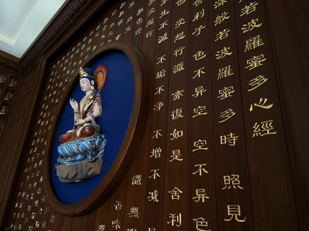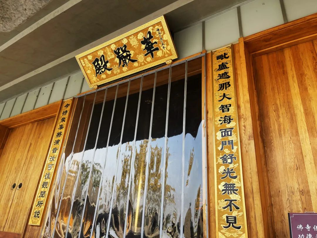 华严殿供奉有“华严三圣”:毗卢遮那佛理智完备,居中位;文殊菩萨主智门,居于左;普贤菩萨主理门,居于右。殿内四壁刻有《华严经》,为大乘佛教修学最重要的经典之一,被大乘诸宗奉为宣讲圆满顿教的“经中之王”,以其深邃的教义、宏大的境界和丰富的象征意义而著称,被视为佛教世界观的最完整介绍。