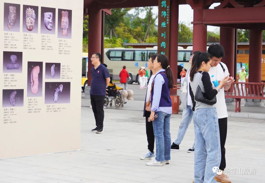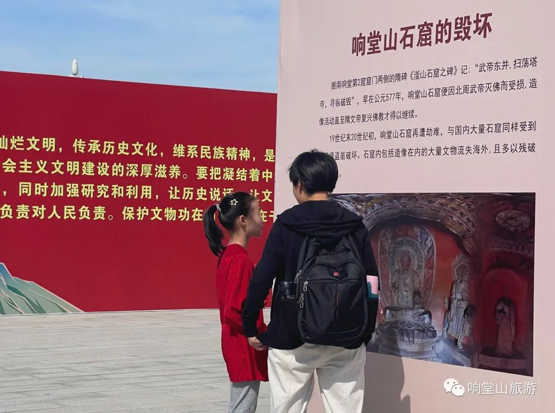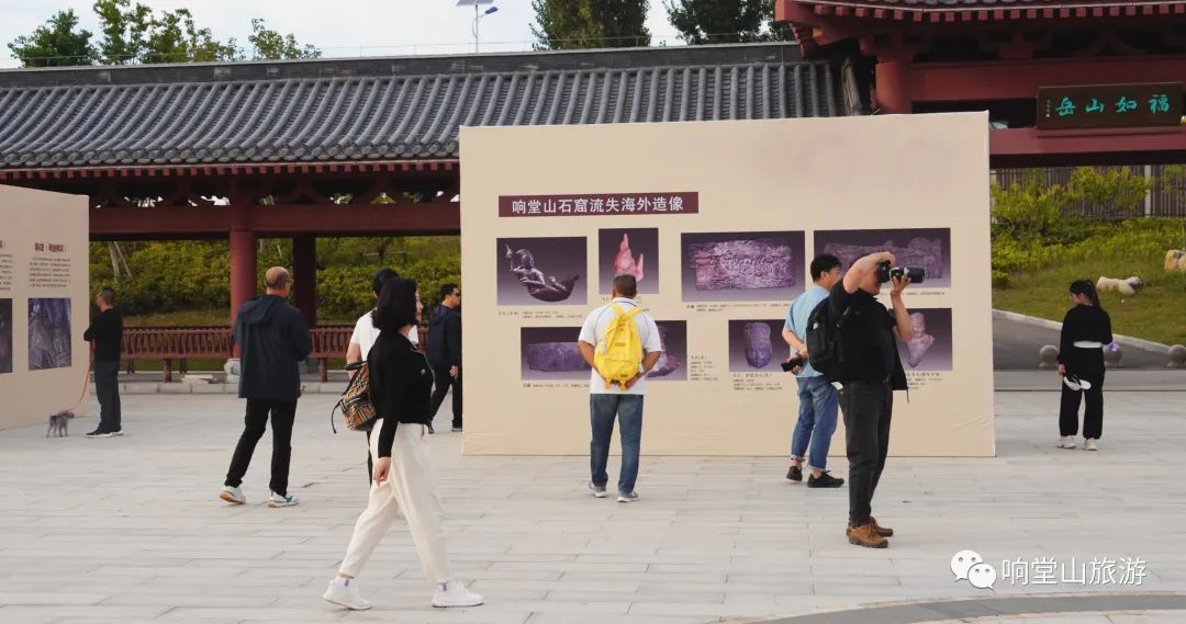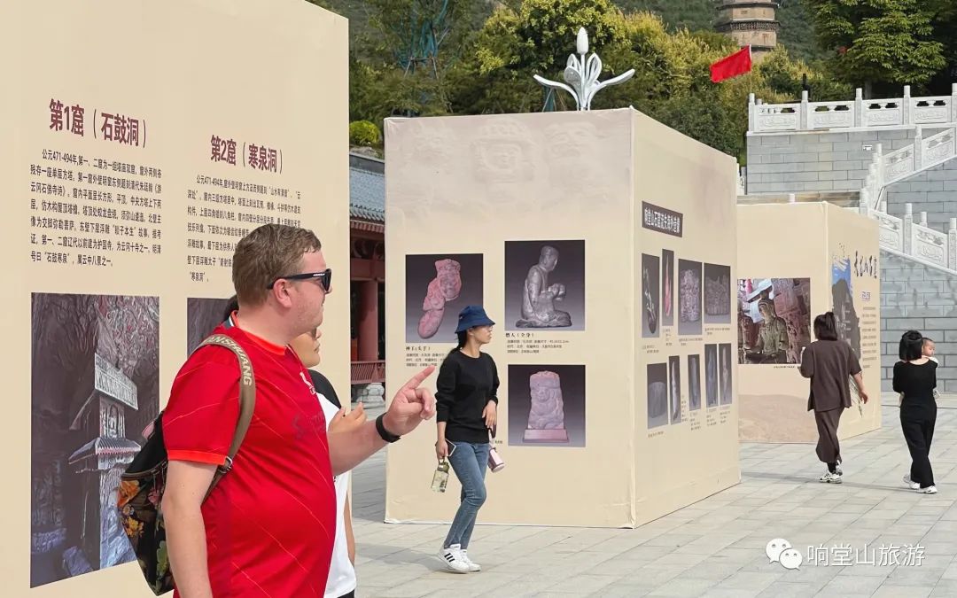 景区金鼓广场布列的“云冈、龙门、响堂山石窟联展”吸引众多的游客驻足欣赏,详细了解了三大石窟的历史流变,风格传承,内在关联,明晰了多元文化的融合汇聚,才得以形成中华文脉的永续传承。