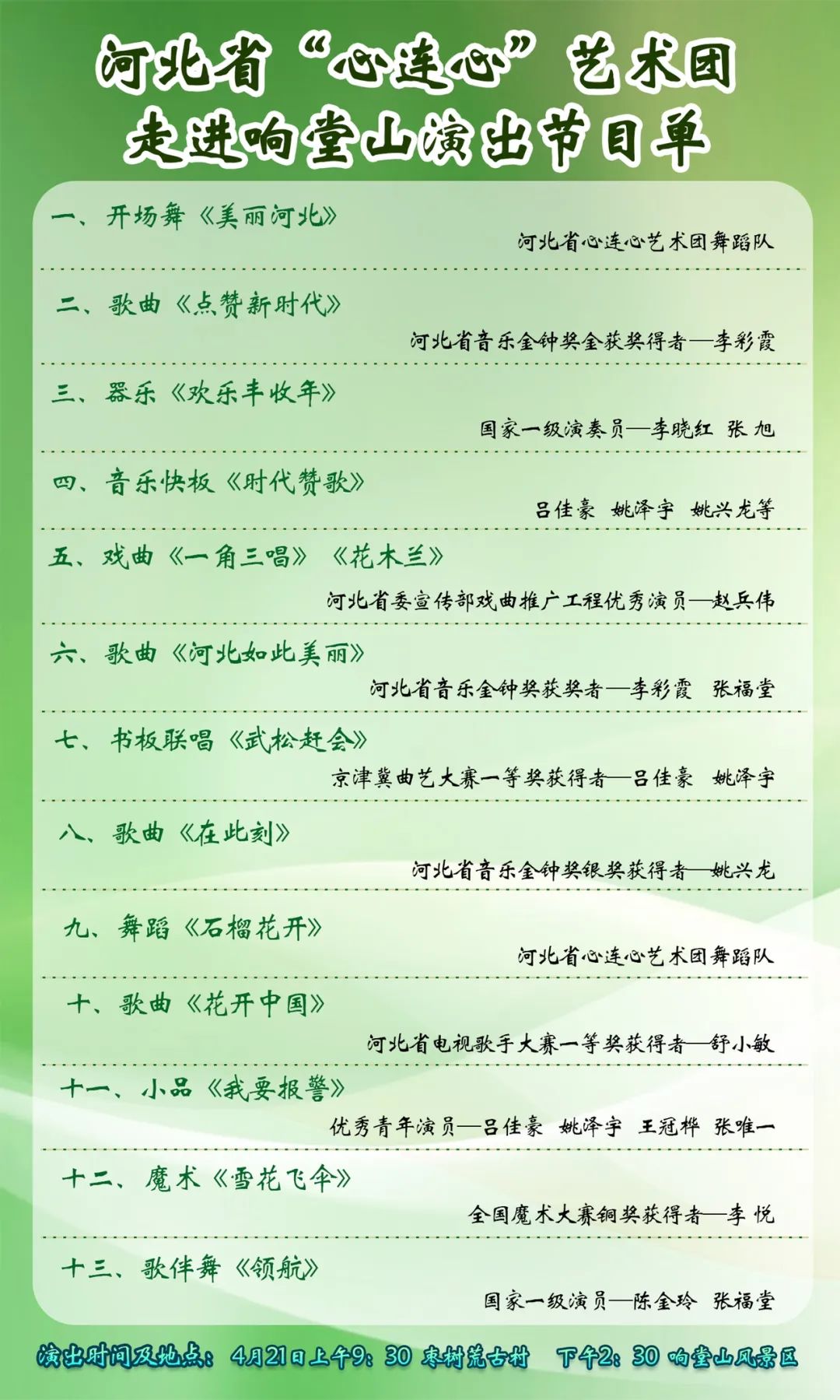 按照河北省、邯郸市委宣传部统一安排部署,河北省心连心艺术团将于4月21日在响堂山景区开展