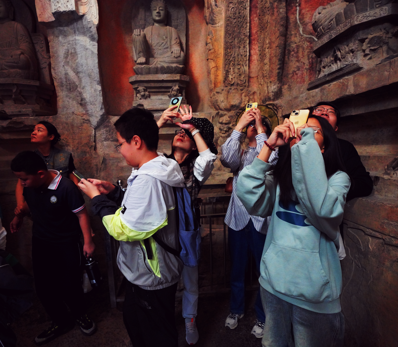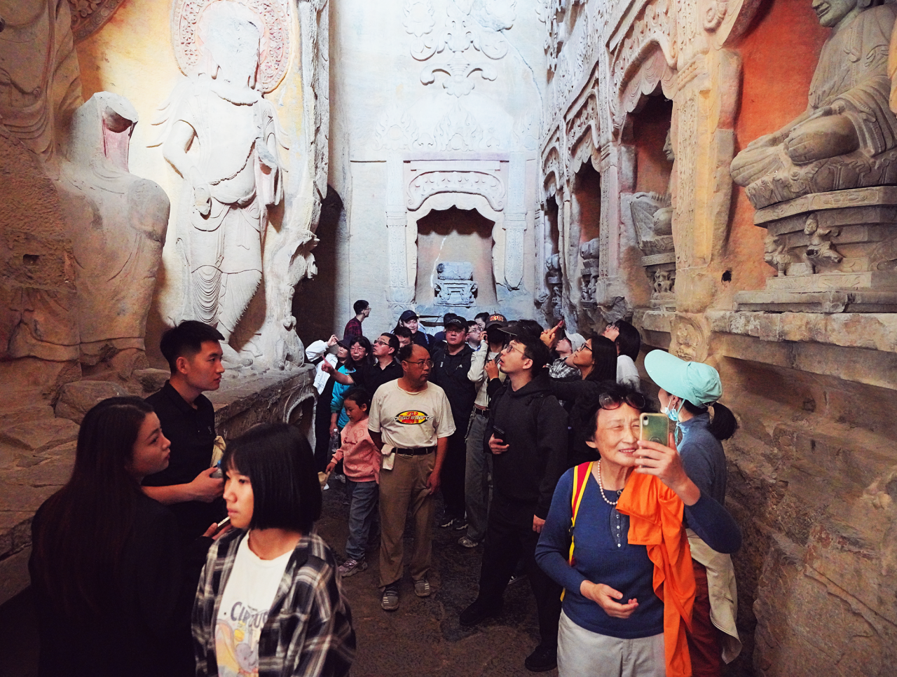 在石窟区,游客们情不自禁纷纷驻足,惊叹于那些历经千年岁月磨洗,仍灵动传神的石刻造像。每一尊佛像,每一幅壁画,每一通经碑,都仿佛在诉说着古代工匠的智慧与虔诚,让人们在欣赏艺术的同时,也深刻感受历史的百代风华。