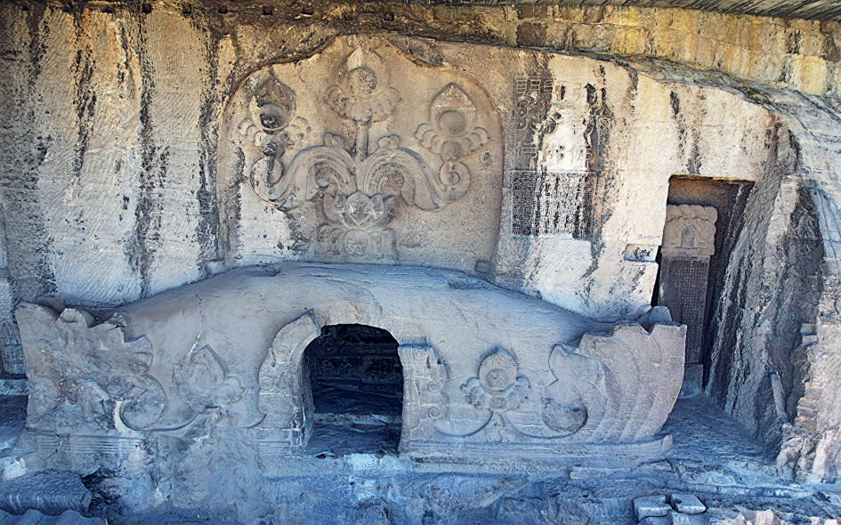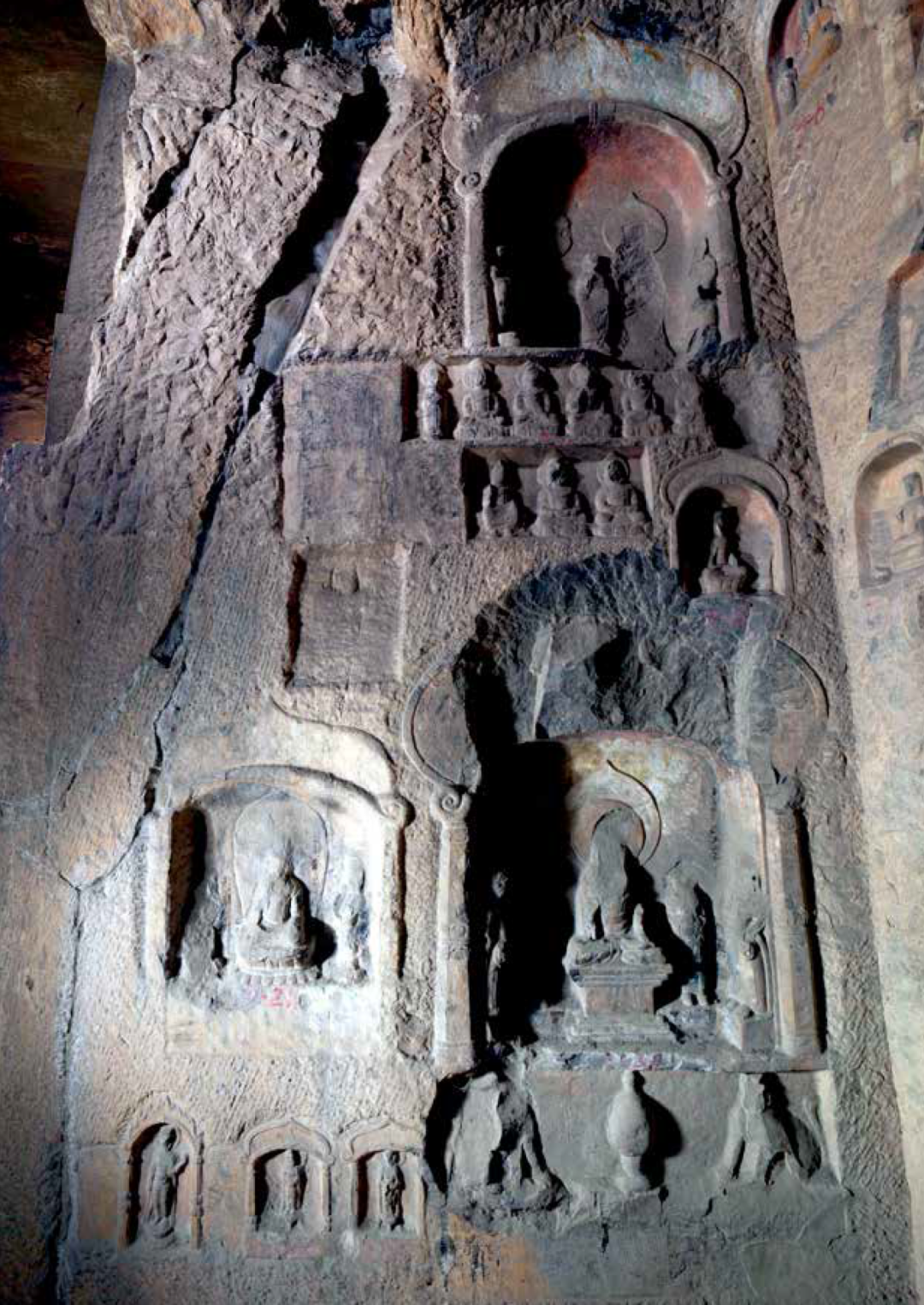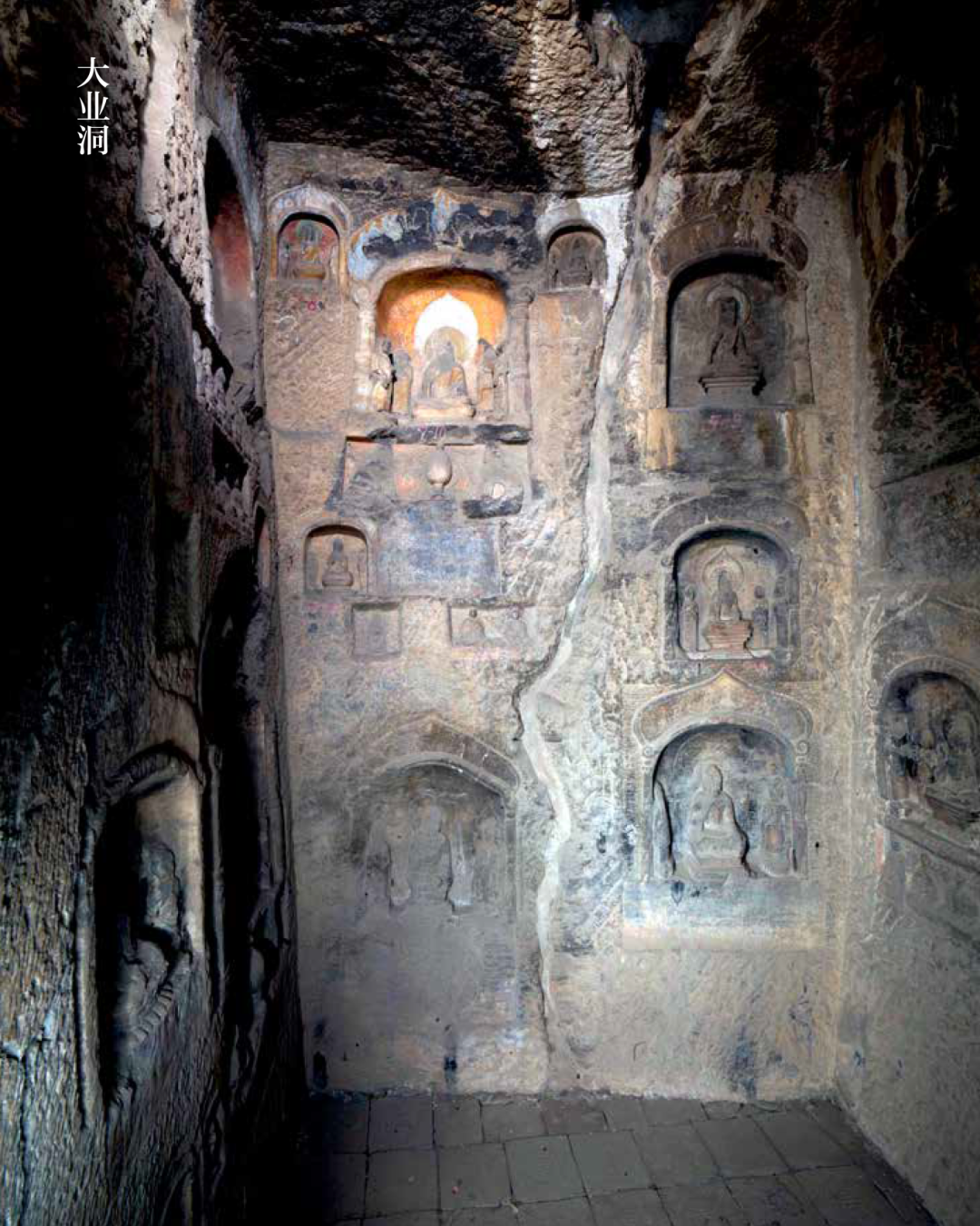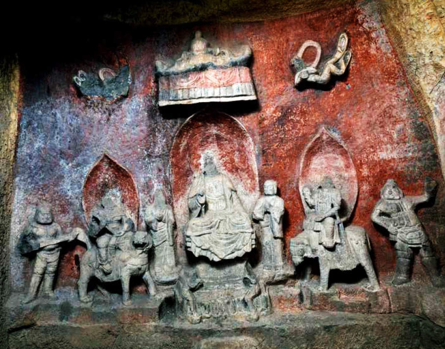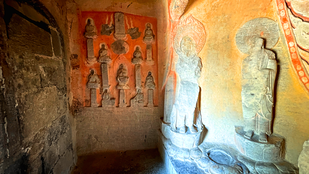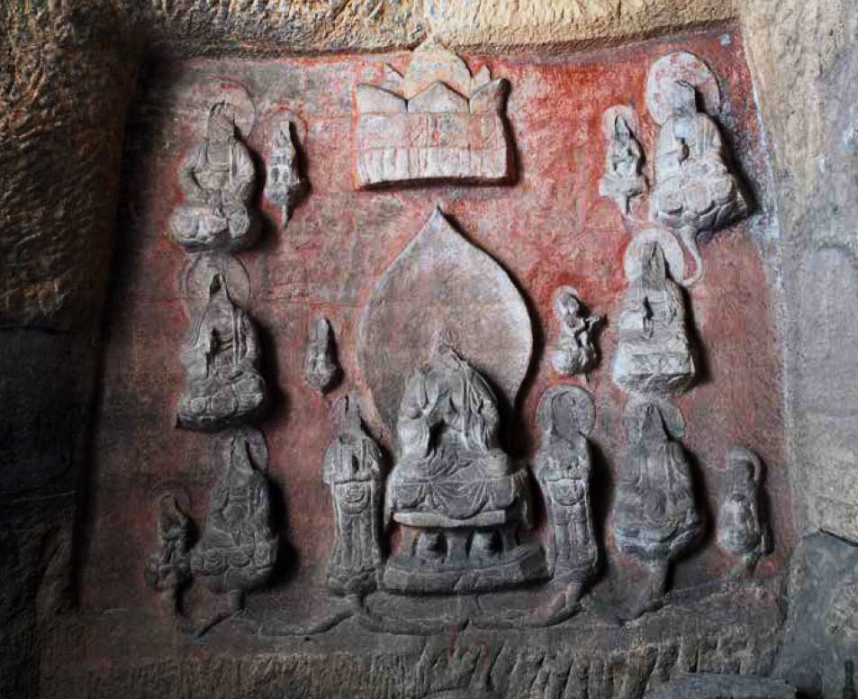 窟内四壁又凿有十六个小佛龛,龛内佛像为后世补刻,佛龛上有火焰宝珠纹十分精美。