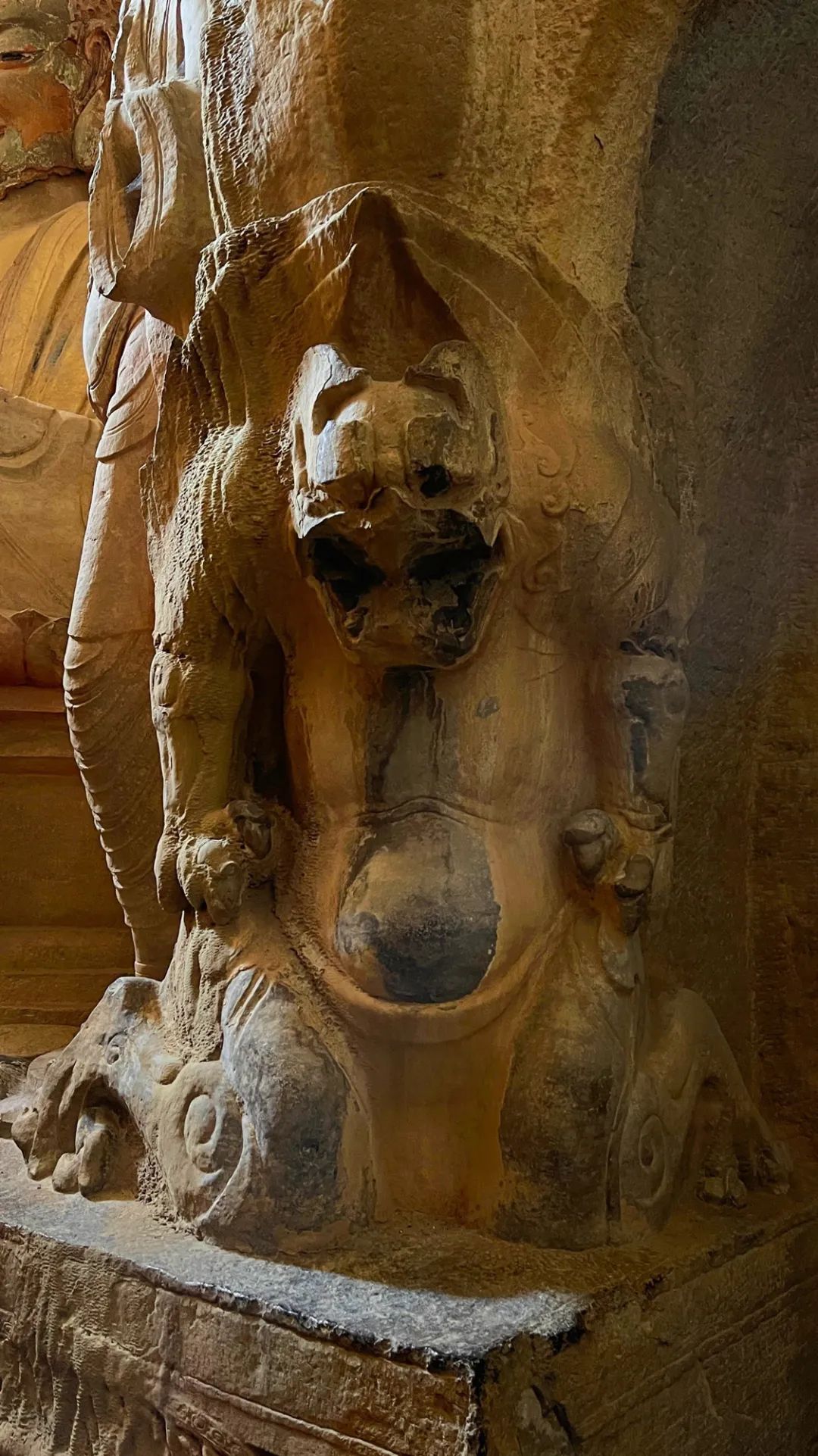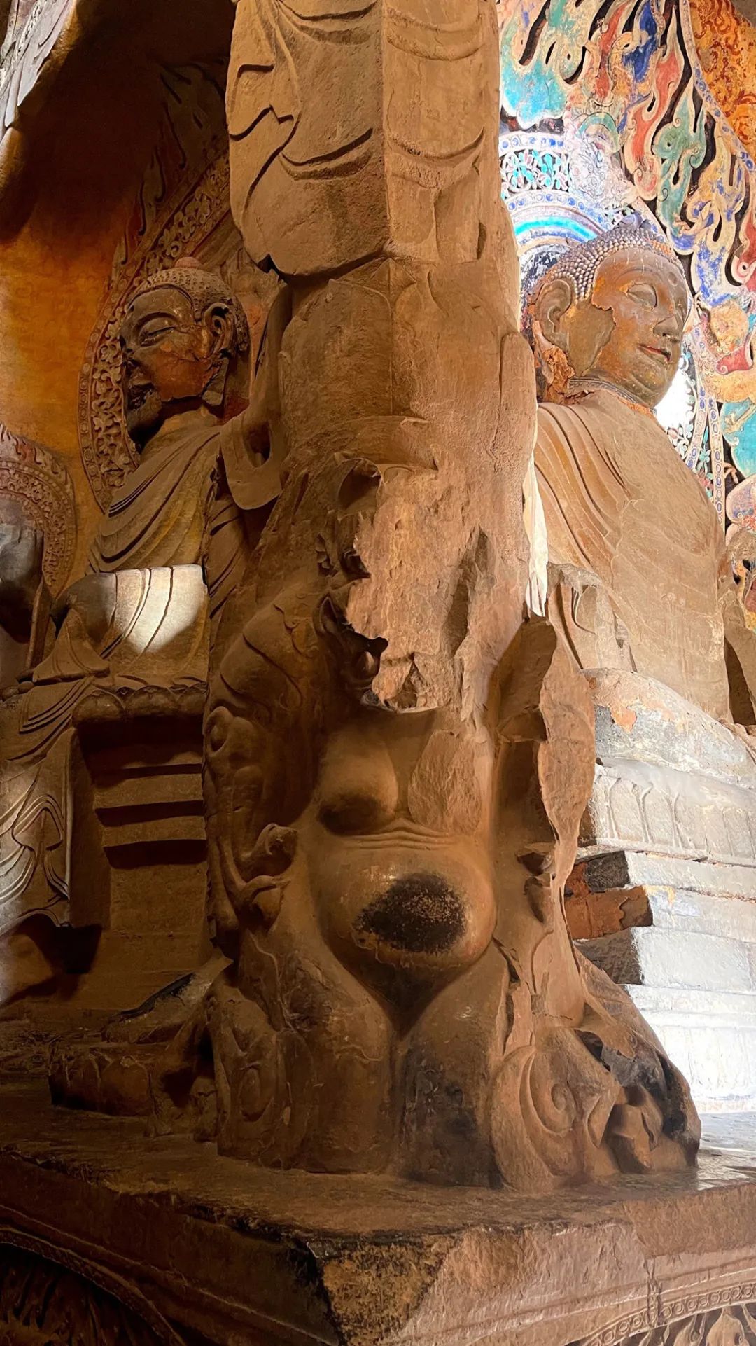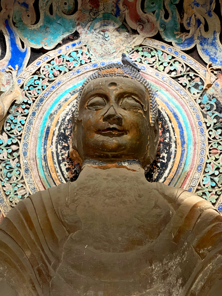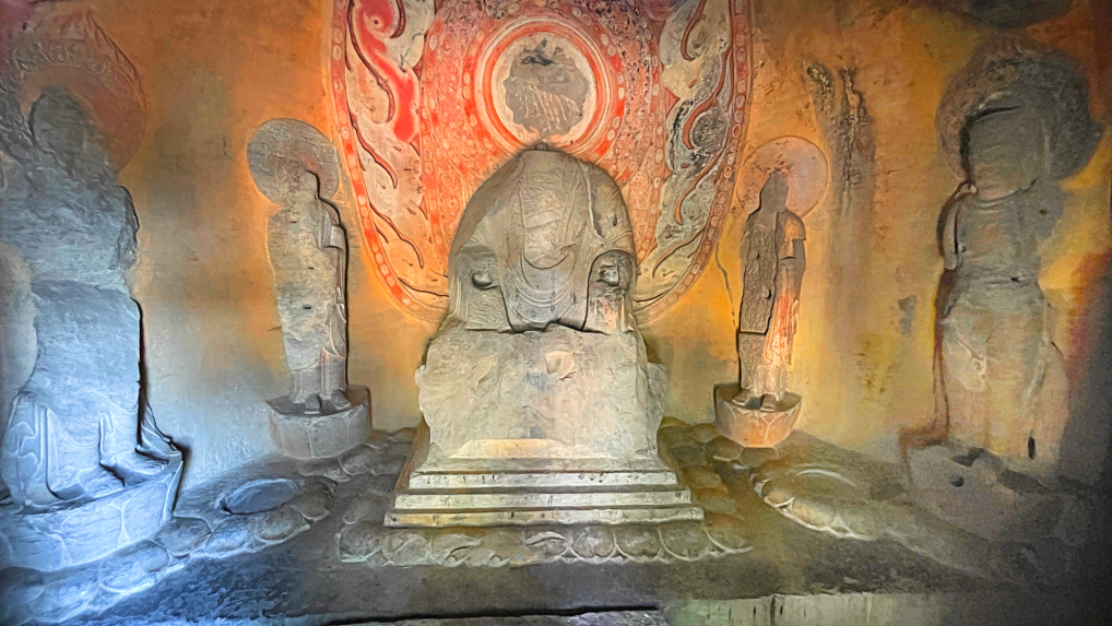 大佛端坐于帷幕帐形龛内,周身着覆搭双肩式袈裟,衣纹稠密,衣纹均向腹部平缓垂,体态圆阔、面颊丰满、面带微笑异于北魏时期的痩骨清相的造型;大佛损毁严重,左右手残毁,须弥宝座和双腿为清代重新修补而成的。主佛的背部为举舟式的火焰纹背光,背光分为四层,每层都用连珠纹饰隔开。每层的内外侧为一圈缠枝纹饰,在缠枝纹的外侧为一圈连枝纹饰完后是为云龙纹,云龙纹是背光的主题纹饰并刻有多条龙形雕塑。这种雕塑与绘画的结合,展示出了极其强烈的视觉效果。