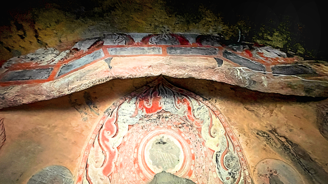 内室三壁开三帷幕帐形龛,窟顶莲花藻井浮雕装饰,主尊造像为三世佛。前室前壁为拱门,窟外有仿木构屋檐形,顶部为覆钵塔样式。刻经洞的洞窟形制与大佛洞、释迦洞有明显的不同。刻经洞是典型的塔形窟的形制,整体与印度的覆钵塔极为的相似,内部不再是中心方柱,而是三龛三壁的形式。