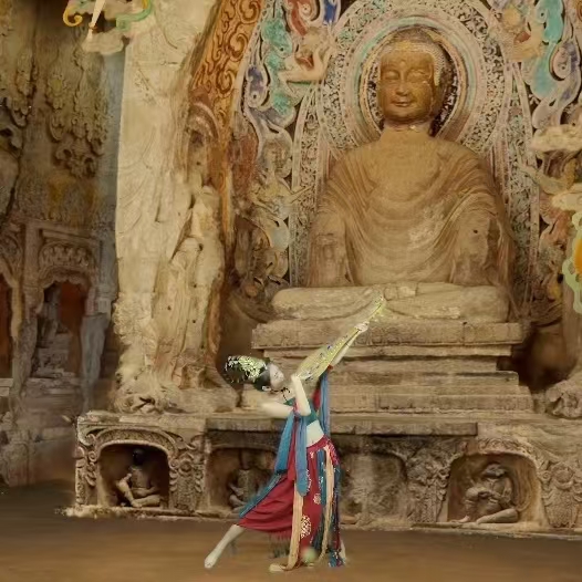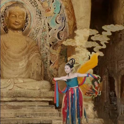 扮作飞天,摇曳身姿,挥舞双臂,衣袂飘飘,身后的大佛近在眼前,艳丽的彩绘鲜明如真……这一刻的你,仿若穿越时空在石窟内如飞天般舞姿翩翩,神态动人!