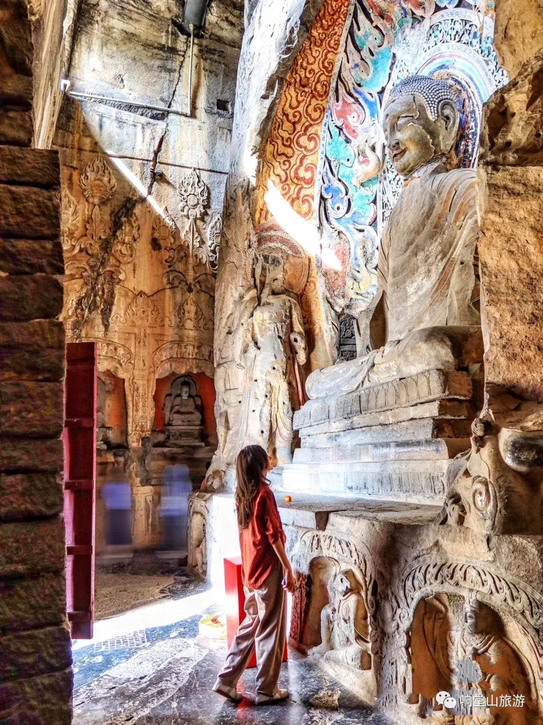 行至山腰处,看到挺阔深邃的石窟,高大肃穆的佛像,让人不禁感叹古人智慧的精妙,技艺的高超,遥望西边的群山,会真切感受“造化钟神秀,阴阳割昏晓”是绝美意境。